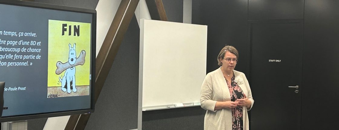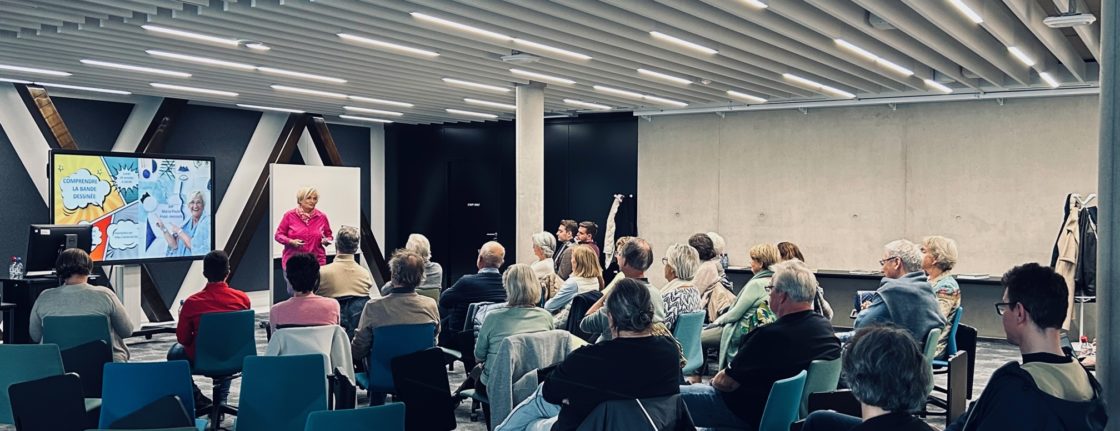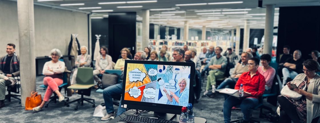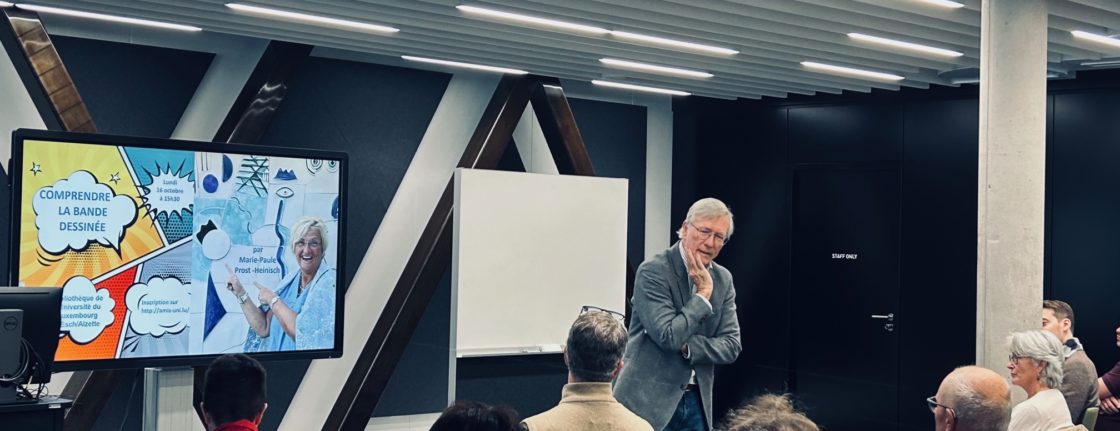 Marie-Paule Prost-Heinisch, physicienne de formation et ancienne directrice de la Fondation contre le cancer, est une passionnée de bande dessinée. Le lundi 16 octobre 2023, les Amis ont eu l’honneur de l’inviter à une conférence intitulée « Comprendre la bande dessinée ». Considérée comme le neuvième art, la bande dessinée peut également véhiculer des messages sociaux, politiques, scientifiques et autres. Le but ultime de la conférence était de faire oublier la perception de la bande dessinée souvent associée aux souvenirs d’enfance et de révéler la richesse de la bande dessinée à un public averti. Une trentaine de personnes s’étaient rassemblées dans la salle de conférence LH 2.02 du Luxembourg Learning Centre pour le constater par elles-mêmes.